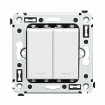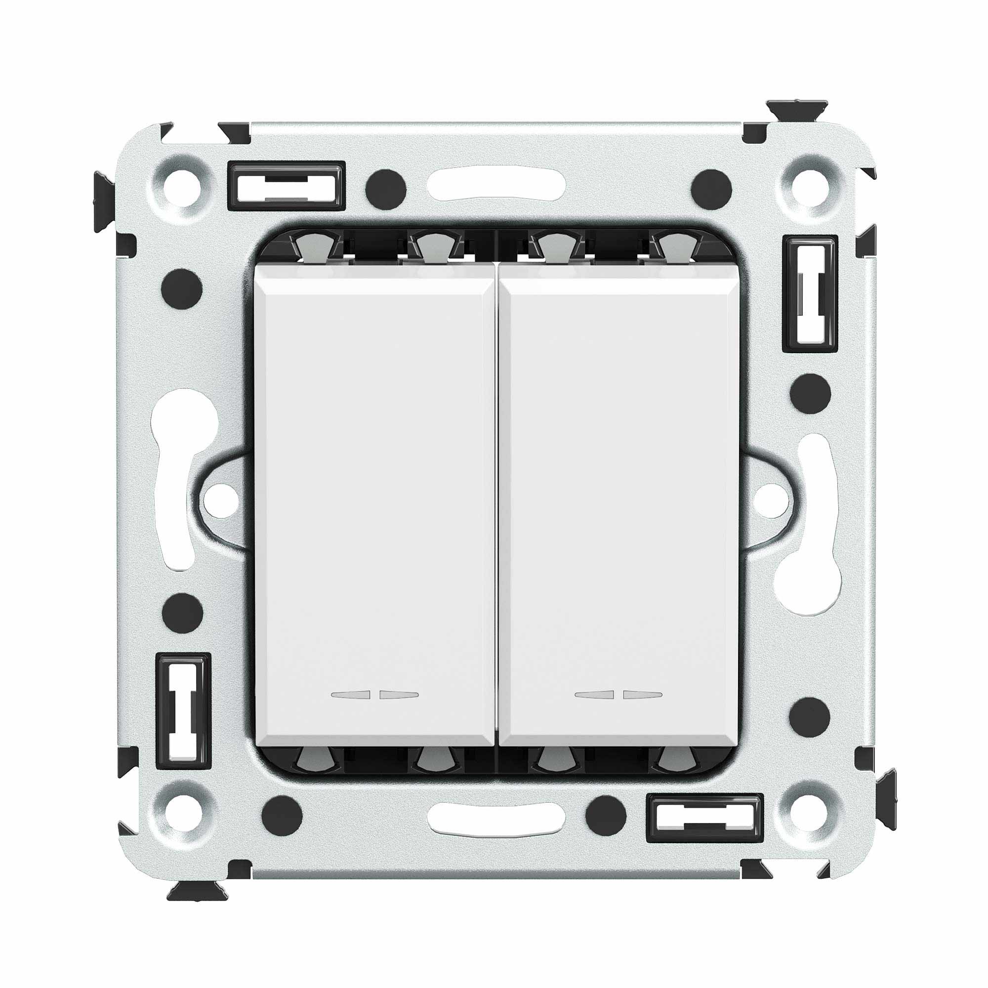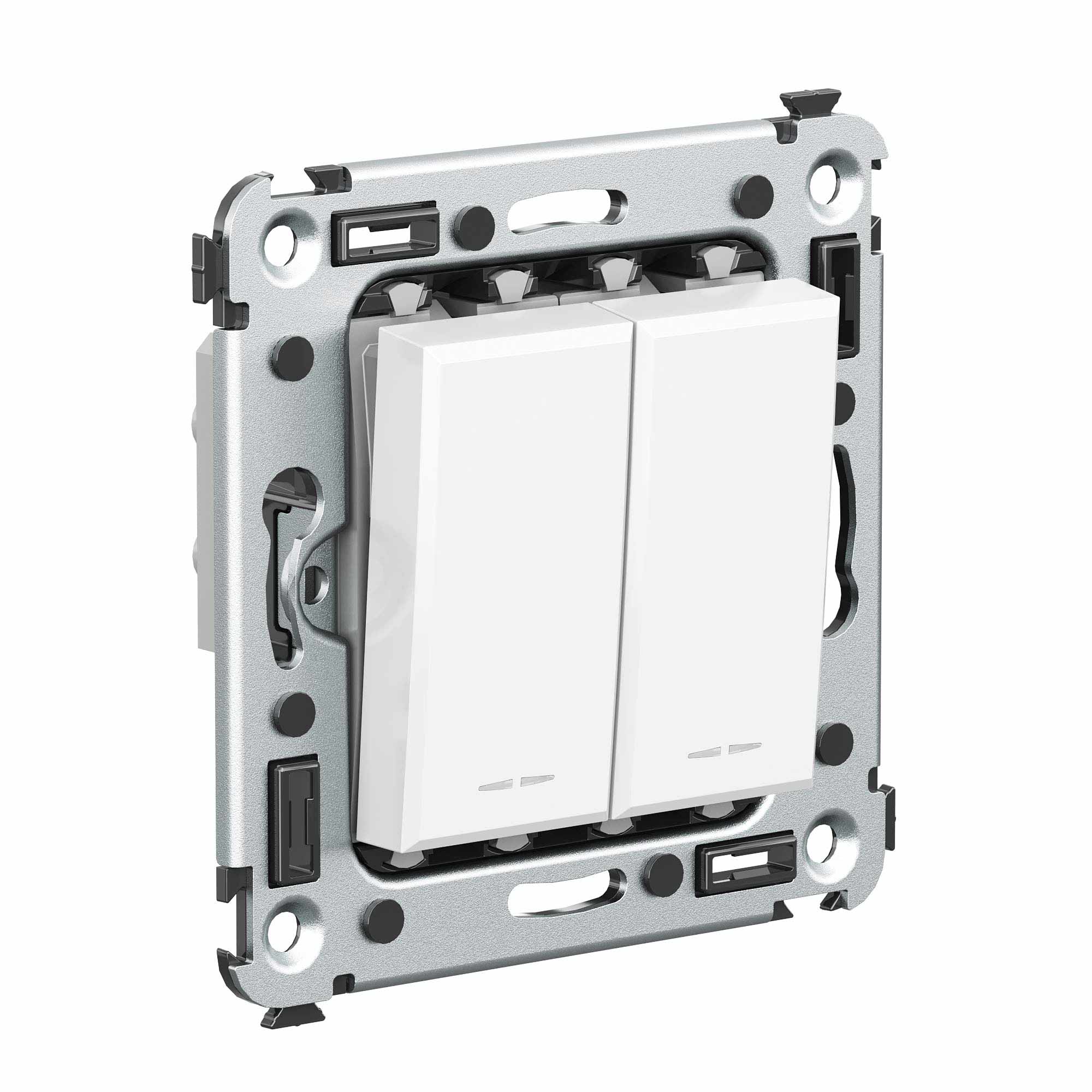 Инвертор двухклавишный. Назначение: для монтажа в подрозеточные коробки глубиной не менее 45 мм (код 59301). Служит для включения/выключения освещения с трех и более мест. Характеристики: 2 модуля, диаметр отверстий для ввода кабелей – 3 мм (по 2 отверстия на одну клемму); винтовые зажимы; фиксация в подрозеточную коробку при помощи саморезов; шаблон для зачистки кабеля – 11 мм; номинальный ток – 16 A; номинальное напряжение – 230 В. Цвет: "Белое облако". <br>