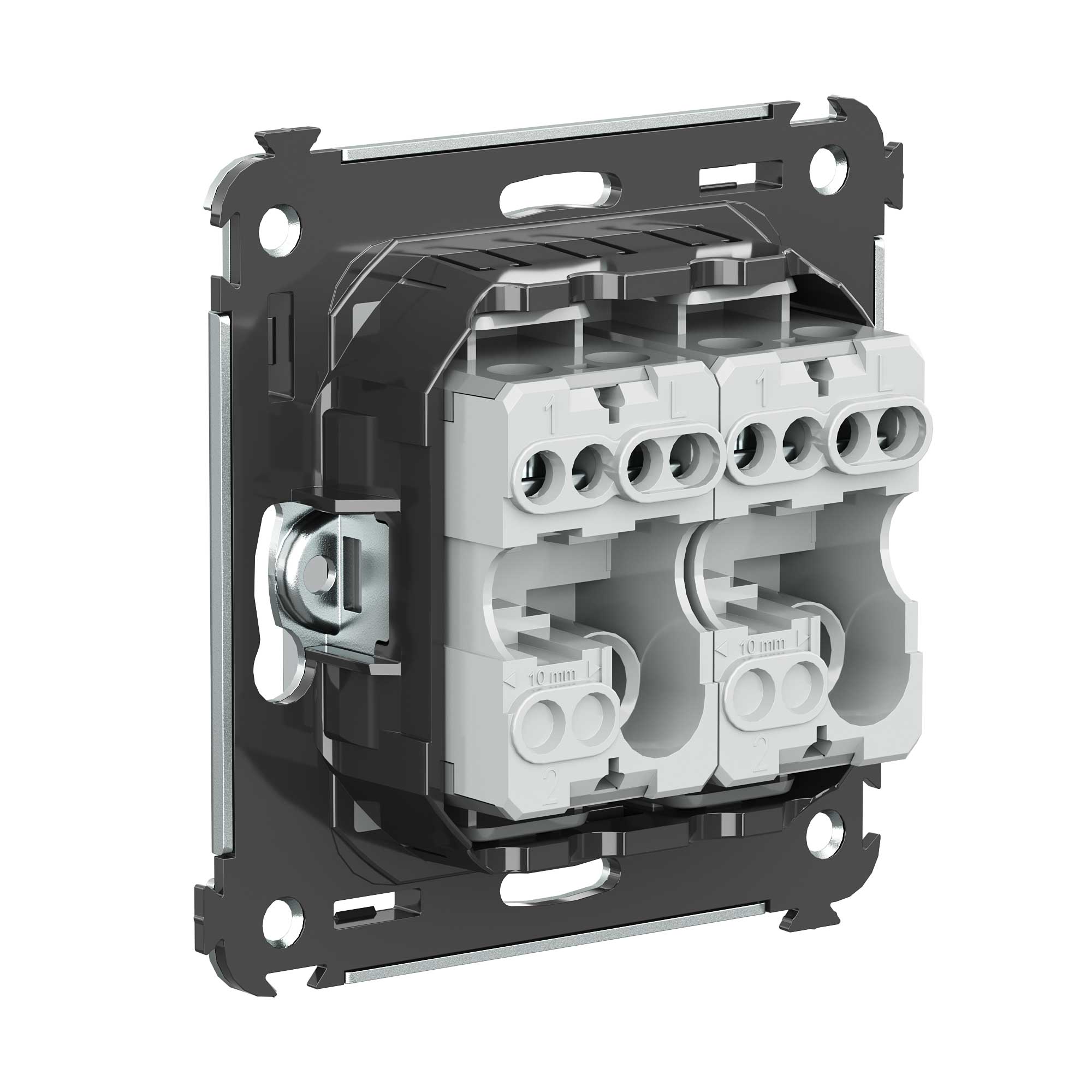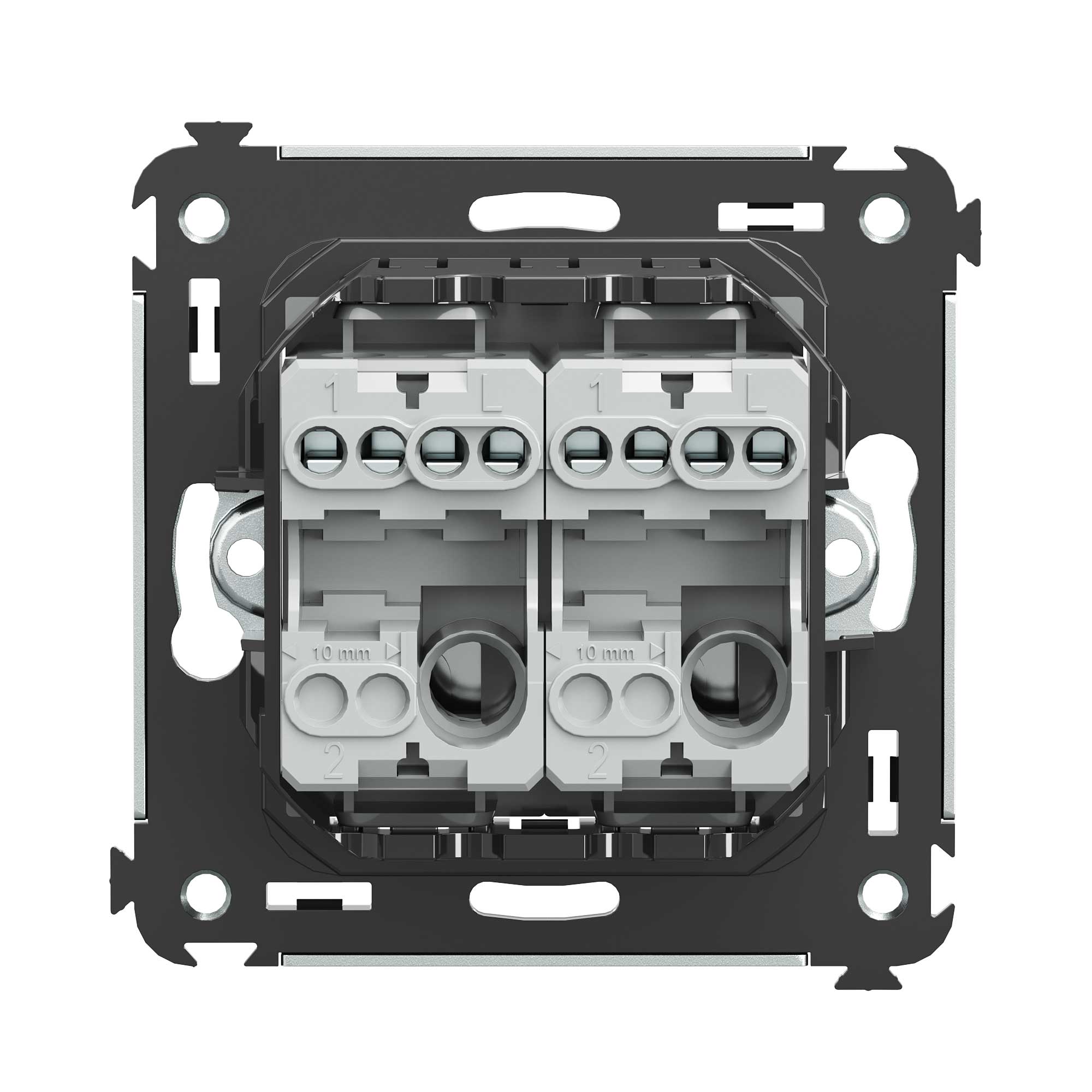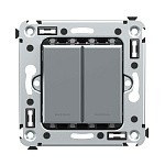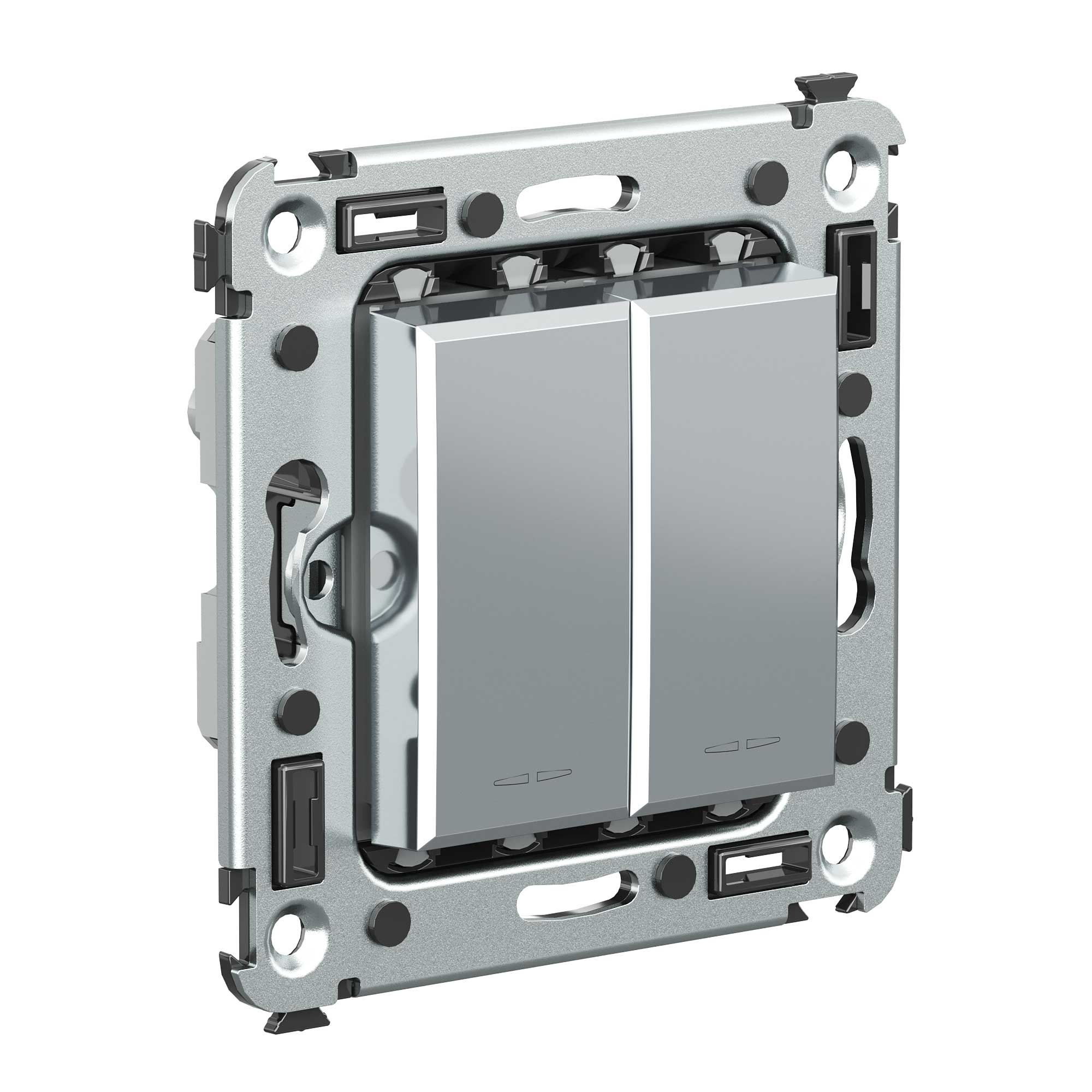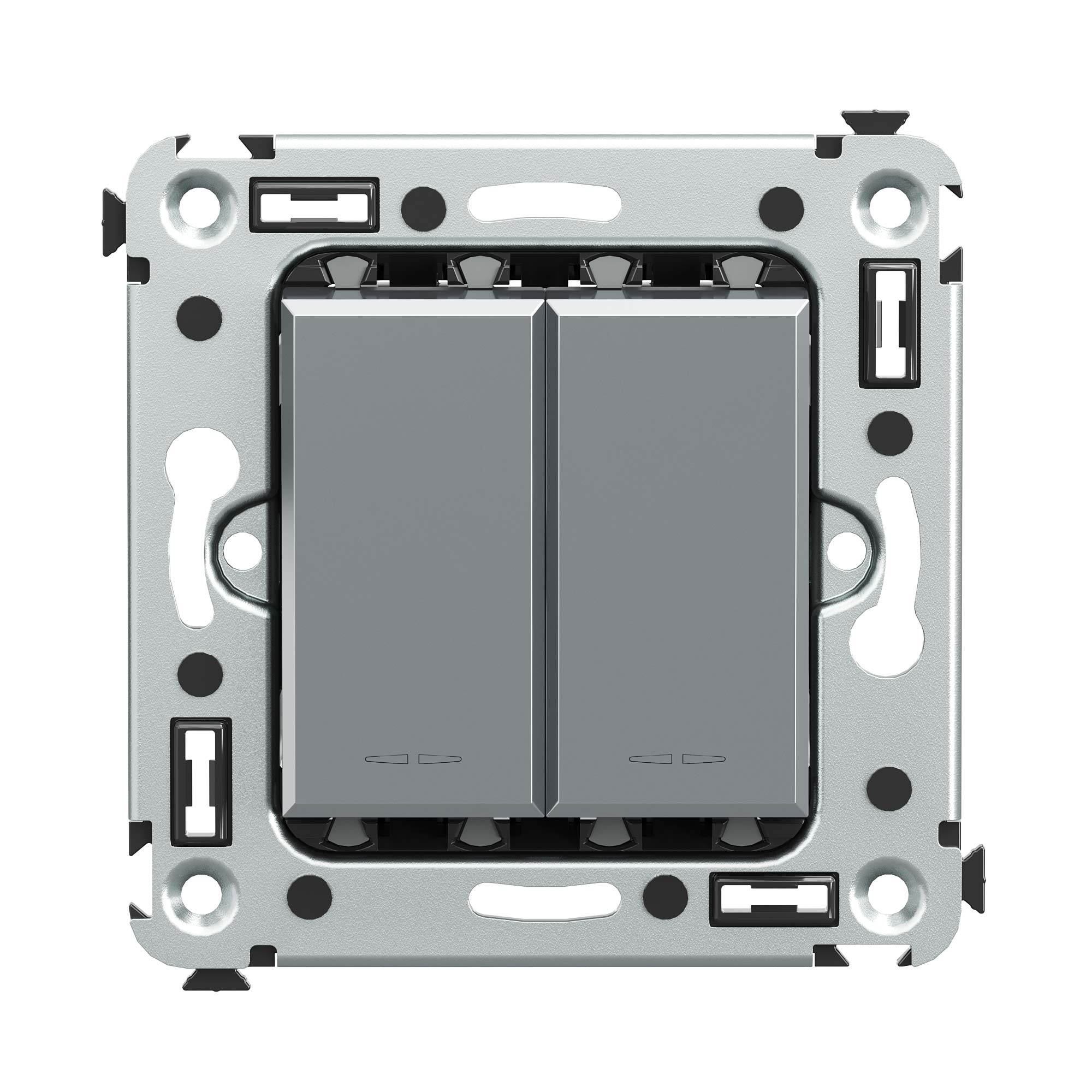 Кнопка двухклавишная. Назначение: для монтажа в подрозеточные коробки глубиной не менее 45 мм (код 59301). Служит в качестве кратковременного включения источника питания энергией. Характеристики: 2 модуля, диаметр отверстий для ввода кабелей – 3 мм (по 2 отверстия на одну клемму); винтовые зажимы; шаблон для зачистки кабеля – 11 мм; номинальный ток – 10 A; номинальное напряжение – 230 В; фиксация в подрозеточные коробки при помощи каркаса с лапками (код 4400802) и саморезов. Цвет: "Закаленная сталь". <br>