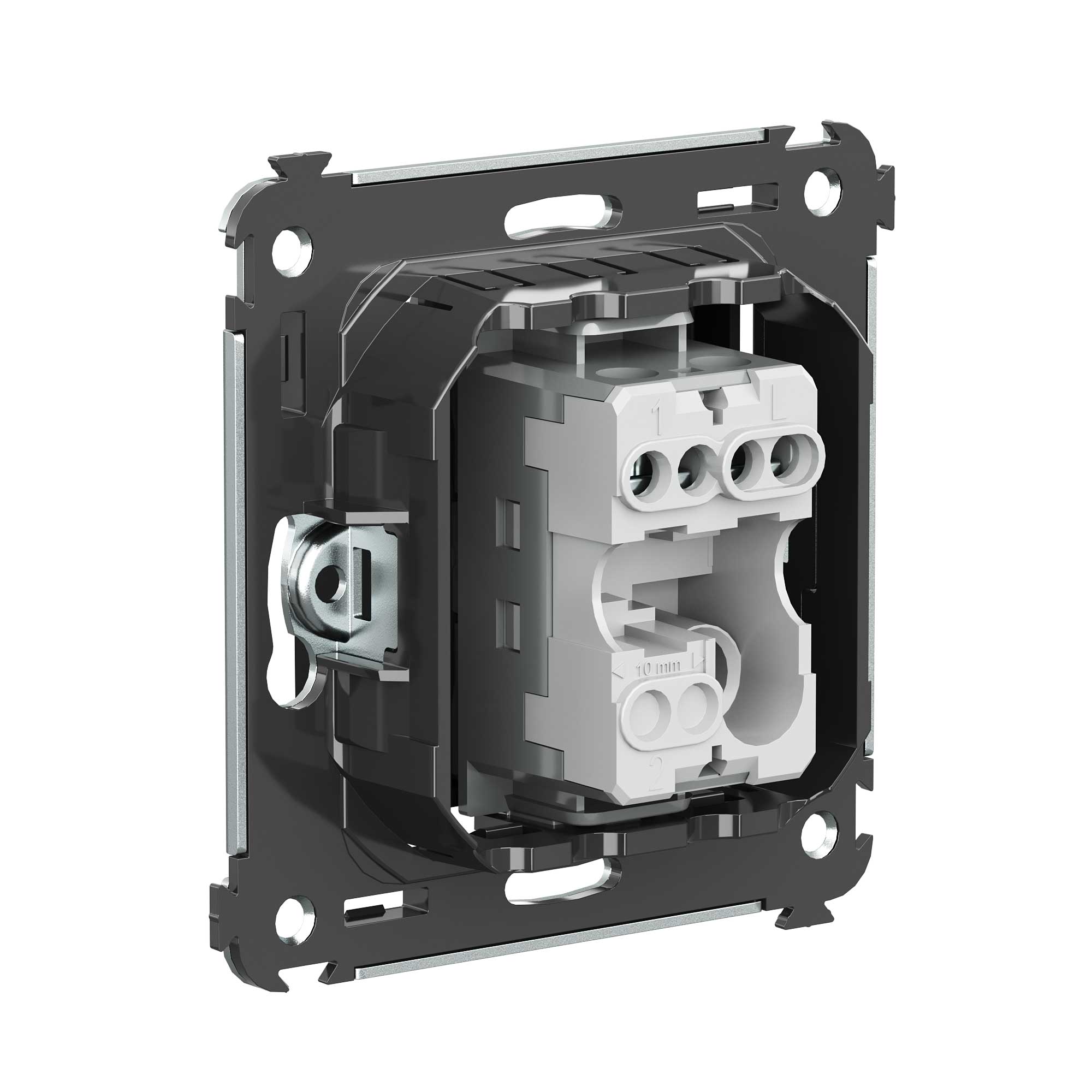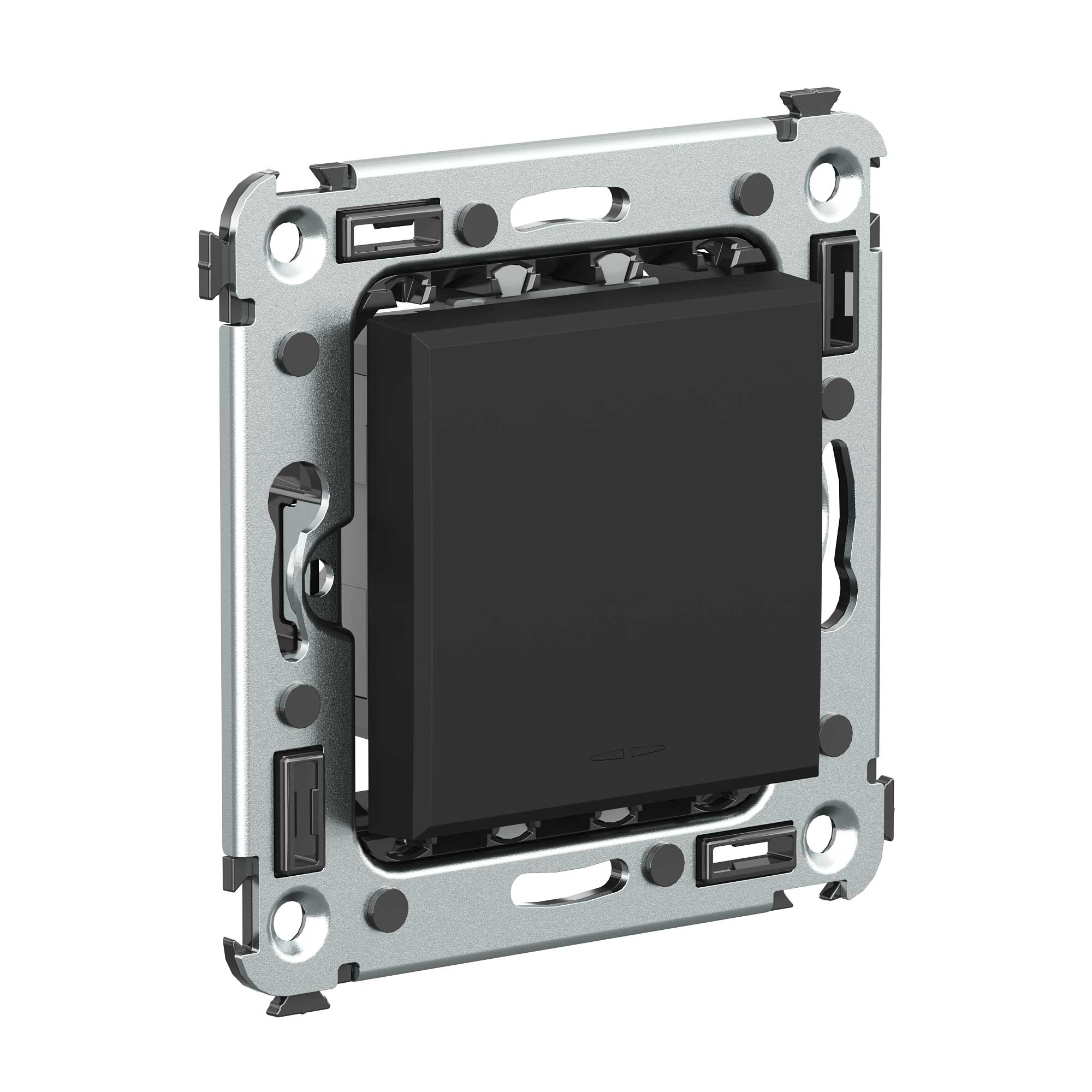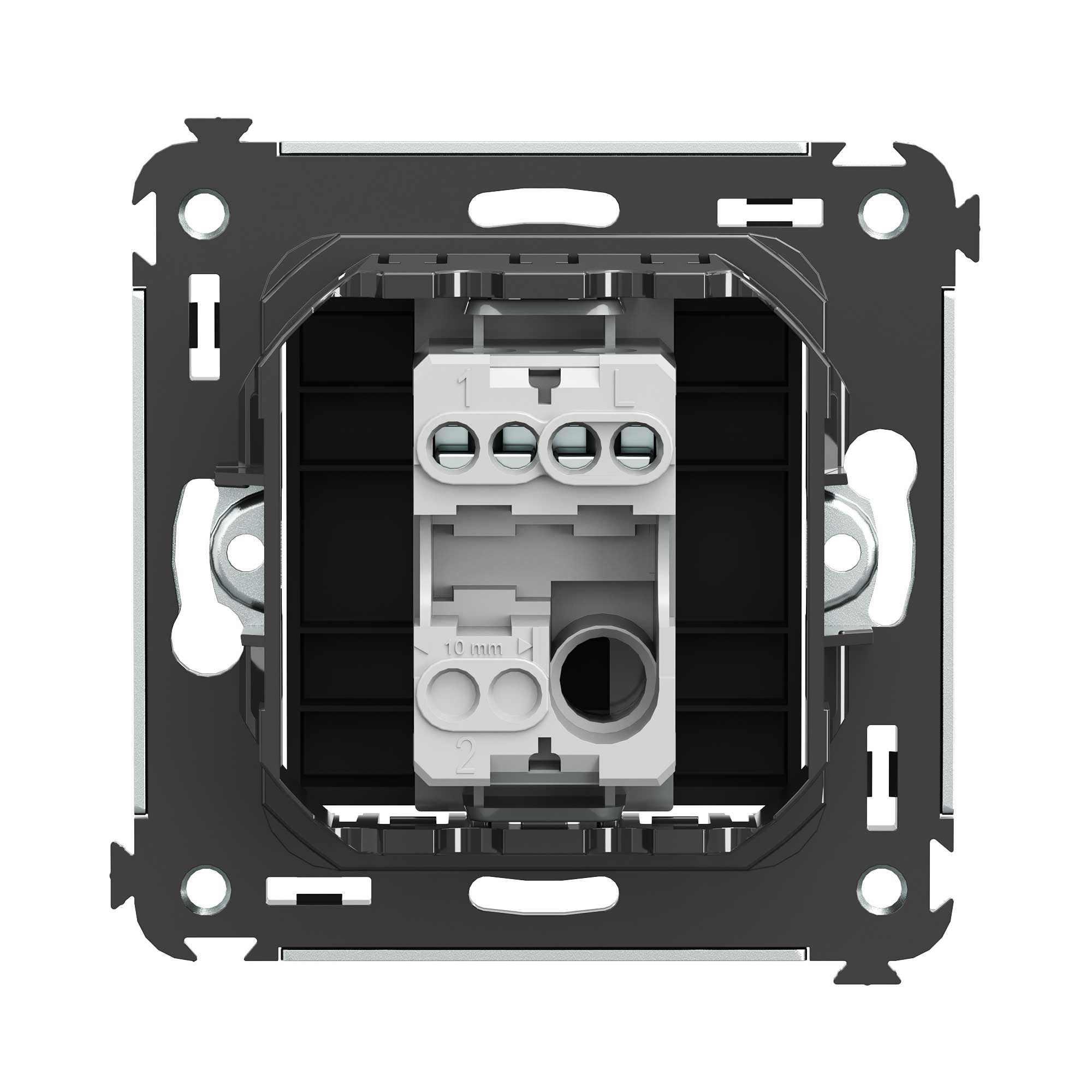 Кнопка одноклавишная. Назначение: для монтажа в подрозеточные коробки глубиной не менее 45 мм (код 59301). Используется в качестве кратковременного включения источника питания энергией. Характеристики: 2 модуля, диаметр отверстий для ввода кабелей – 3 мм (по 2 отверстия на одну клемму); винтовые зажимы; шаблон для зачистки кабеля – 11 мм; номинальный ток – 10 A; номинальное напряжение – 230 В; фиксация в подрозеточные коробки при помощи каркаса с лапками (код 4400802) и саморезов. Цвет: "Черный матовый".