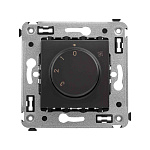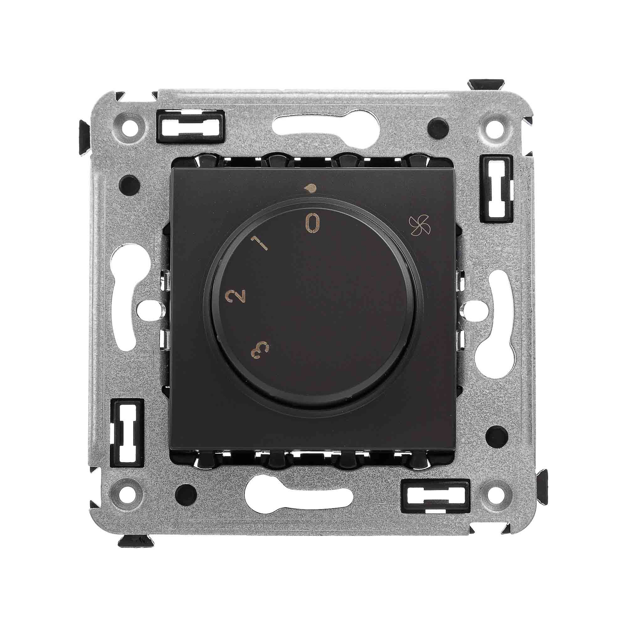 Механизм управления вентиляторами. Назначение: для монтажа в подрозеточные коробки глубиной не менее 45 мм (код 59301). Предназначен для управления вентиляторами. Характеристики: номинальное напряжение – 230 В; 3 скорости работы; диаметр отверстий для ввода кабелей – 3 мм; винтовые зажимы; шаблон для зачистки кабеля – 11 мм. Фиксация производится в подрозеточные коробки глубиной не менее 45 мм при помощи каркаса с лапками (код 4400802) и саморезов. Цвет: "Черный матовый".