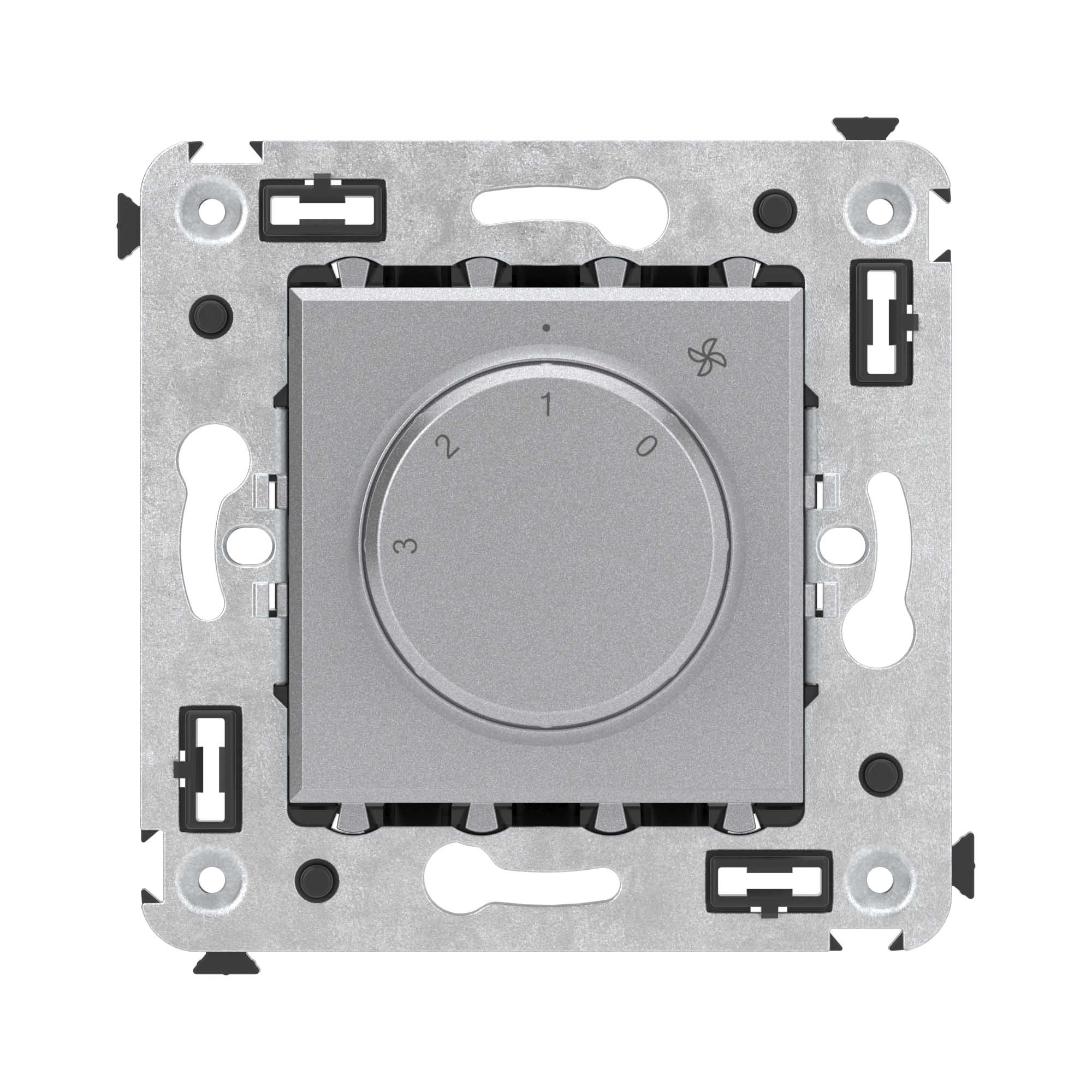 Механизм управления вентиляторами. Назначение: для монтажа в подрозеточные коробки глубиной не менее 45 мм (код 59301);. Предназначен для управления вентиляторами. Характеристики: номинальное напряжение – 230 В; 3 скорости работы; диаметр отверстий для ввода кабелей – 3 мм; винтовые зажимы; шаблон для зачистки кабеля – 11 мм; фиксация в подрозеточные коробки глубиной не менее 45 мм при помощи каркаса с лапками (код 4400802) и саморезов. Цвет: "Закаленная сталь". <br>