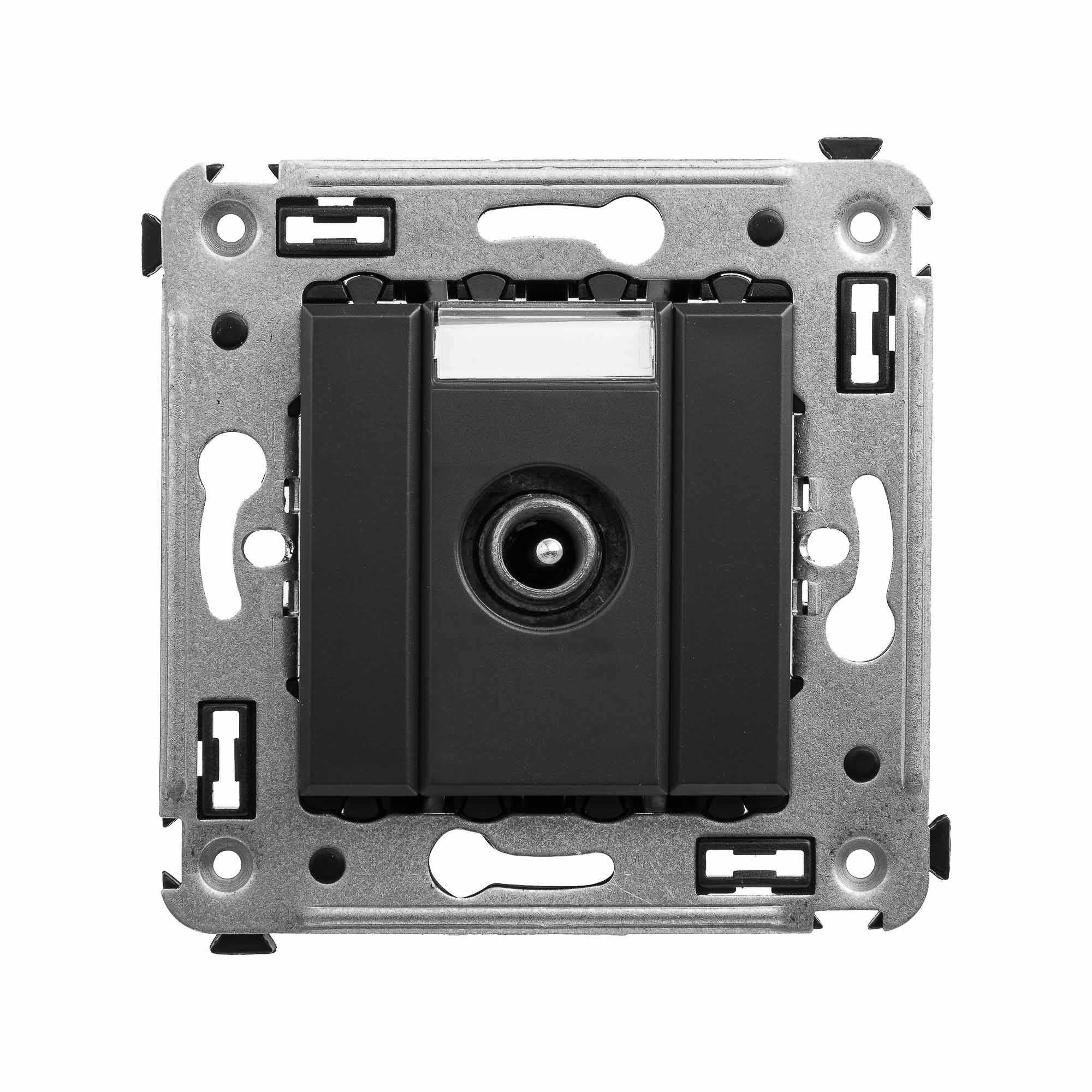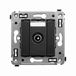 Розетка TV проходная в стену. Предназначена для монтажа в подрозеточные коробки глубиной не менее 45 мм (код 59301). Используется для подключения телевизионного кабеля к телевизору. Винтовые зажимы. Диапазон рабочих частот 4–2400 МГц; затухание <1 дБ. 2 модуля. Цвет: "Черный матовый".