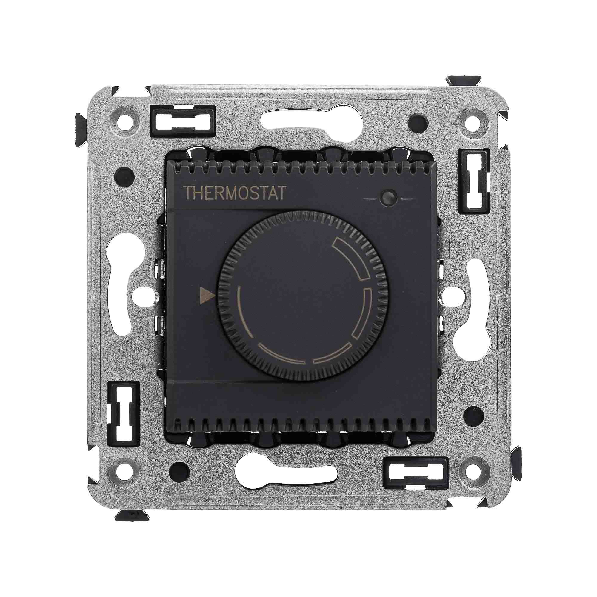Термостат для теплых полов. Назначение: для монтажа в подрозеточные коробки глубиной не менее 45 мм (код 59301);. Предназначен для управления теплыми полами. Характеристики: диапазон от 5 до 30 °С; частота – 50–60 Гц; номинальное напряжение – 230 В; лампа-индикатор включается, когда температура в комнате падает ниже выбранного значения; нагрузка: 12 A – cosφ=1; 4,8 A – cosφ=0,4. Фиксация производится в подрозеточные коробки глубиной не менее 45 мм при помощи каркаса с лапками (код 4400802) и саморезов; провод датчика температуры в комплекте (длина 3,5 метра). 2 модуля. Цвет: "Черный матовый".