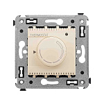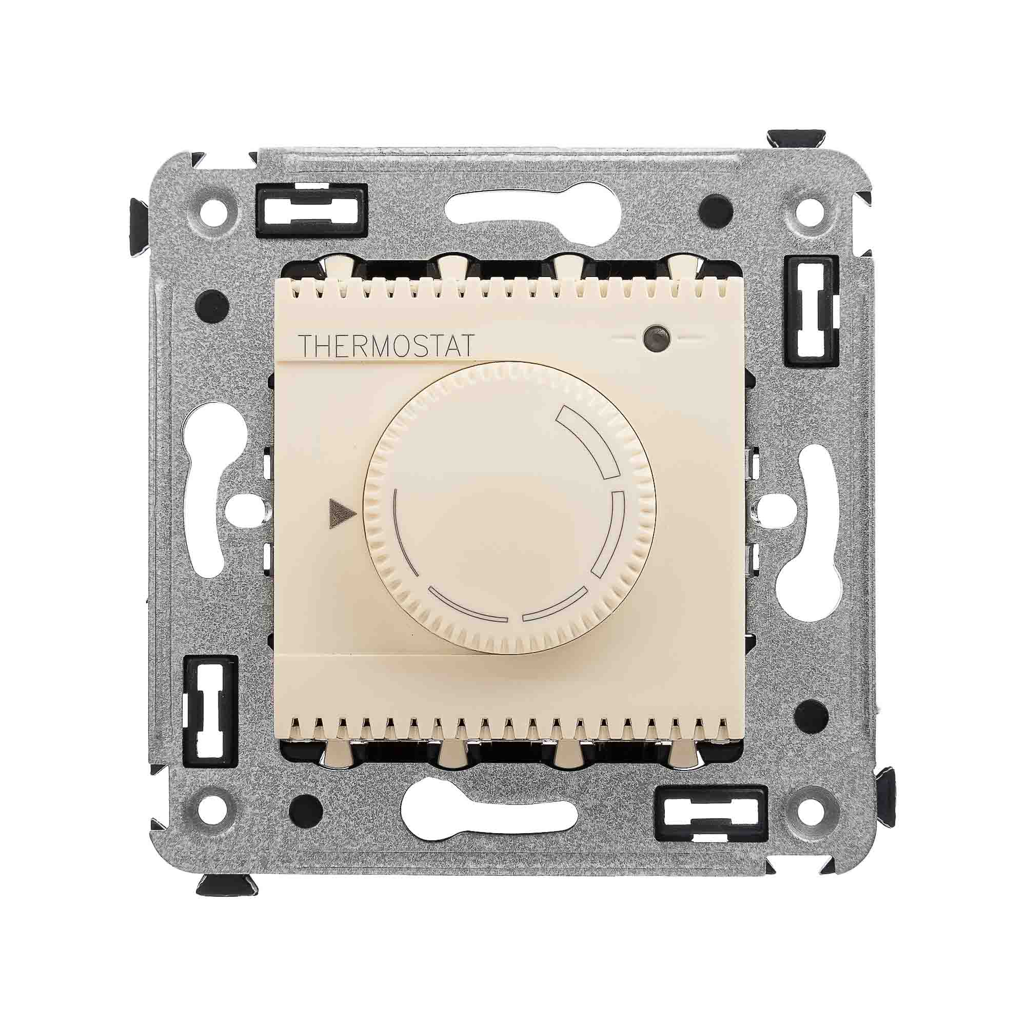 Термостат для теплых полов. Назначение: для монтажа в подрозеточные коробки глубиной не менее 45 мм (код 59301);. Предназначен для управления теплыми полами. Характеристики: диапазон от 5 до 30 °С; частота – 50–60 Гц; номинальное напряжение – 230 В; лампа-индикатор включается, когда температура в комнате падает ниже выбранного значения; нагрузка: 12 A – cosφ=1; 4,8 A – cosφ=0,4; фиксация в подрозеточные коробки глубиной не менее 45 мм при помощи каркаса с лапками (код 4400802) и саморезов; провод датчика температуры в комплекте (длина 3,5 метра). Цвет: "Ванильная дымка".