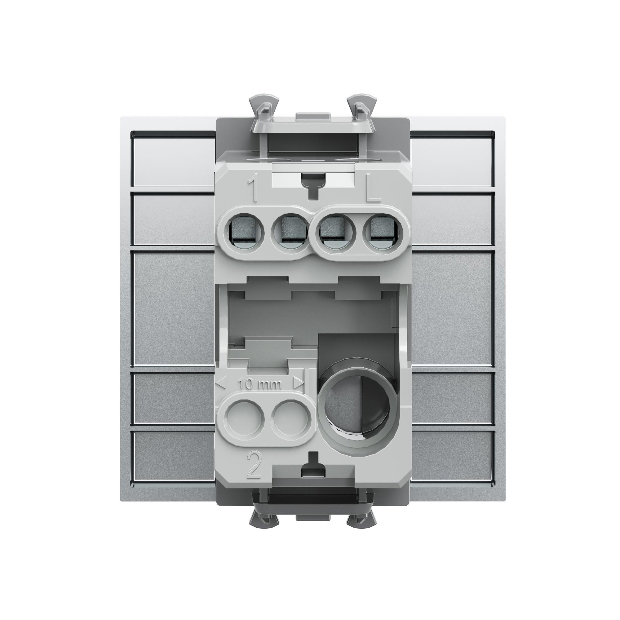 Выключатель одноклавишный однополюсный, модульный. Предназначен для монтажа в систему кабельных коробов «In-liner Front» и систему организации рабочих мест «Сотто» (Sotto) при помощи рамок-суппортов и каркасов «Avanti» (код 4400912 и т. д.); используется для включения/выключения освещения. Характеристики: диаметр отверстий для ввода кабелей — 3 мм (по 2 отверстия на одну клемму); винтовые зажимы; шаблон для зачистки кабеля — 11 мм; номинальный ток — 16 A; номинальное напряжение — 230 В; возможна фиксация в подрозеточные коробки при помощи каркаса с лапками (код 4400802) и саморезов. 2 модуля. Цвет: «Закалённая сталь». Производитель оставляет за собой право вносить во внешний вид изделия изменения, которые не влияют на его функционал, безопасность и надёжность.
