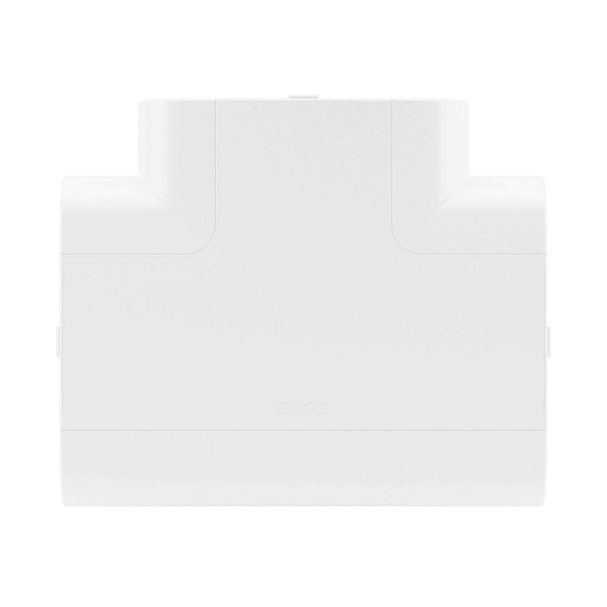 Тройник (Т-образный отвод) предназначен для безопасного и декоративного оформления мест Т-образного соединения кабельных коробов. Конструкция состоит из внутренней базы с разделителем и внешней декоративной накладки, формирующих прочное и точное соединение без зазоров. База и разделители выполнены из ПНД, устойчивого к механическим воздействиям и перепадам температуры, а накладка — из АБС-пластика с гладкой поверхностью с высокой цветостойкостью. Типоразмер изделия — 110×50 мм, цвет — белый, что обеспечивает совместимость с основными сериями кабельных каналов ДКС.