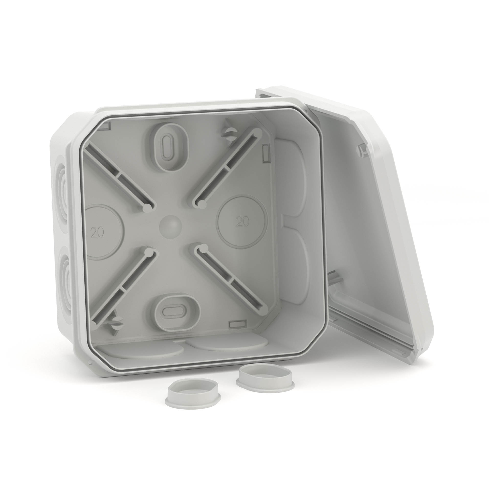 Применяется для защиты и эстетичного оформления мест соединения кабелей (информационных, осветительных, силовых). Коробка имеет 8 герметичных вводов по периметру для ввода жестких и гофрированных труб, а также кабелей с максимальным диаметром 20 мм, и 2 дополнительных ввода на торцевой части коробки для ввода жестких и гофрированных труб, а также кабелей диаметром 20 мм. Параметры 85x85х40 мм (внутренние размеры) и 94х94х48 мм (внешние размеры). Квадратная форма. Материал – пластик. Крышка - матовая, непрозрачная, закрывается защелкиванием. IP55 по ГОСТ 14254. Можно устанавливать как в помещении, так и на открытом воздухе (при условии защиты от воздействия прямых солнечных лучей и осадков). Цвет - серый. Температура эксплуатации от –25 до +60 °С. Halogen free.